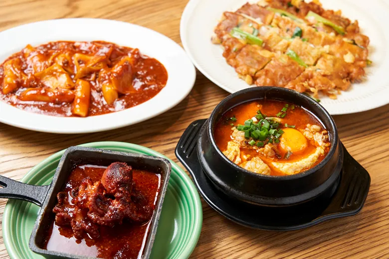 貝の出汁におぼろ豆腐と野菜がたっぷり入った『スンドゥブチゲ』や、タコとわけぎが